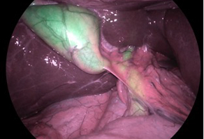 Regular tissue shown in magenta, while ICG appears green. These two colors are the complete opposite on the color wheel resulting in the highest contrast image for greater clarity.